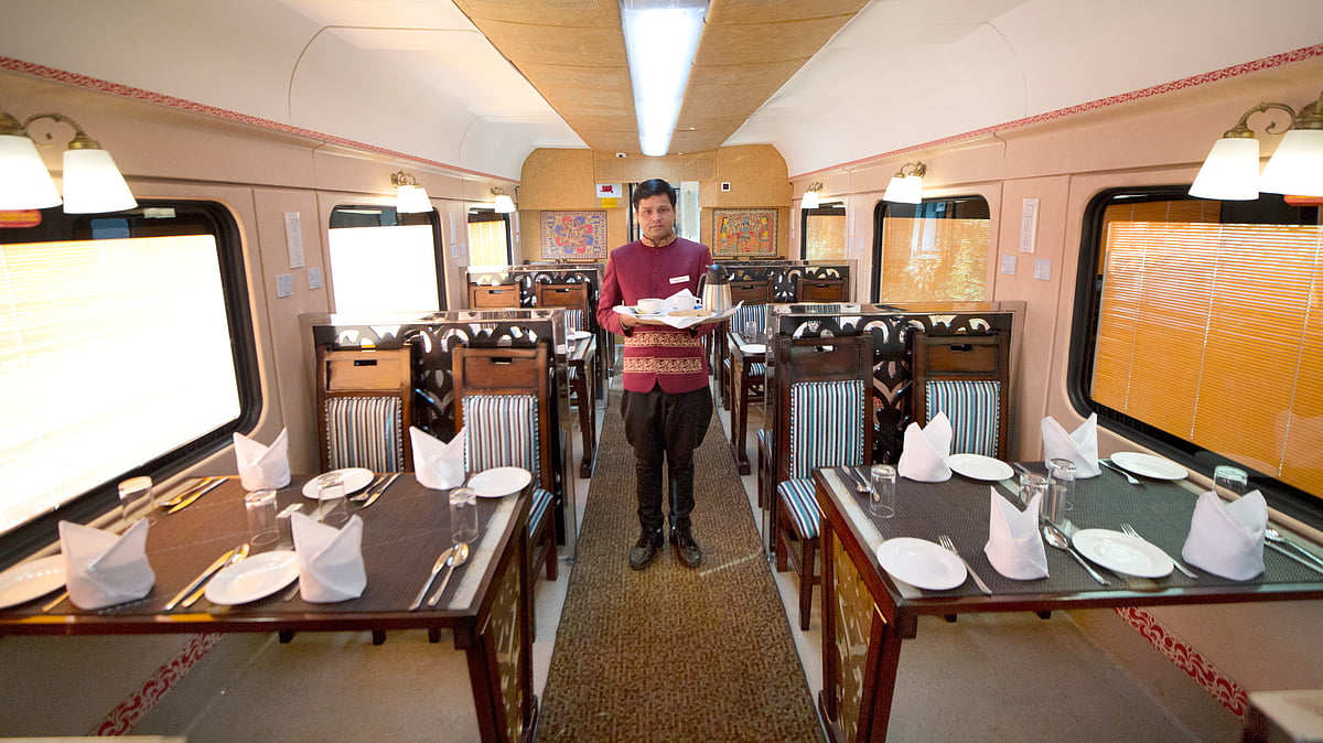 The AC I coaches, besides being cozy and has spacious cabins and coupes, have been fitted with in-room amenities like individual lockers for tourists. The train also has spacious AC-II Tier coaches which have been modified to have only spacious and comfortable cabins with separate sitting area. Besides, the train has 2 aesthetically designed dining cars with capacity of 64 passengers each to dine together. The train has a fully equipped kitchen car which serves an array of specialty international and local cuisines for the on-board guests.