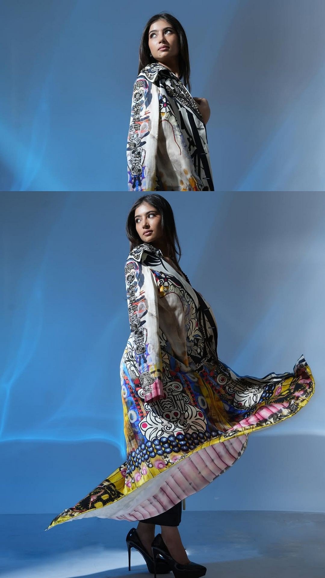 Sara Arjun turned heads alongside Ranveer Singh at the Dhurandhar: The Revenge music launch in Mumbai, effortlessly stealing the spotlight with her bold fashion choiceFor the glamorous evening, the young actress opted for a couture three-piece ensemble by Anamika Khanna, blending edgy glamour with artistic detailingShe donned a chic black crop top intricately embellished with red, blue and black beadwork, adding a textured, high-fashion appealThe look was balanced with a sleek, plain black midi skirt, allowing the upper silhouette and layering to truly stand outThe highlight of the outfit was a vibrant, multi-hued tribal printed long jacket, reportedly priced at ₹1.50 lakh, which added drama Elevating the look further, Sara accessorised with bold trio earrings featuring blue sapphires, diamonds and emeralds, paired with a coordinated bangle and ringHer glam stayed on point with smoky eyes, softly flushed cheeks, radiant highlighted skin and nude lips, while her sleek middle-parted straight hair completed the runway-ready look