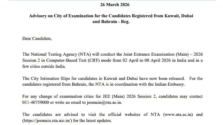 JEE Main 2026 Session 2 City Slip: The National Testing Agency (NTA) has released the city intimation slips for the candidates who have registered from Dubai and Kuwait for the JEE Main 2026 Session 2 exam, which will provide the candidates with early information about the centers where they will have to appear for the exam. However, the candidates from Bahrain are still awaiting the information, as the agency has informed that the coordination with the Indian Embassy is underway.